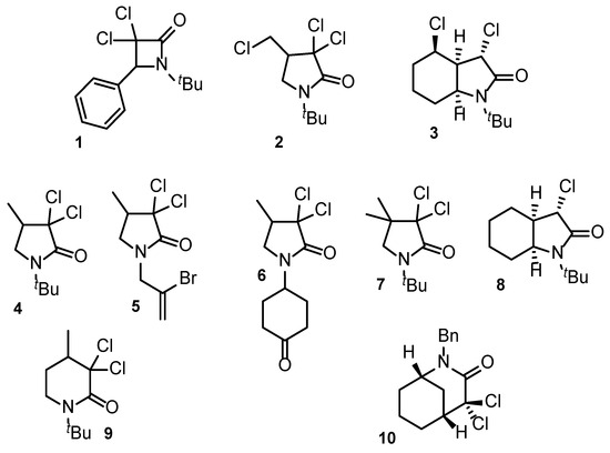 - Diaba, F.; Sandor, A.G.; Morán, M.d.C. Microwave-Assisted Atom Transfer Radical Cyclization in the Synthesis of 3,3-Dichloro-γ- and δ-Lactams from N-Alkenyl-Tethered Trichloroacetamides Catalyzed by RuCl2(PPh3)3 and Their Cytotoxic Evaluation. Molecules 2024, 29, 2035. [Google Scholar] [CrossRef]