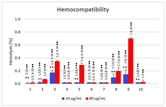 The percentage of hemolysis induced by compounds 1–10 as a function of the concentration. The data correspond to the average of three independent experiments ± standard deviation. ** (p < 0.001) indicates significant differences between concentrations for the same compound. ●● (p < 0.001) indicates significant differences between compounds for the same concentration.