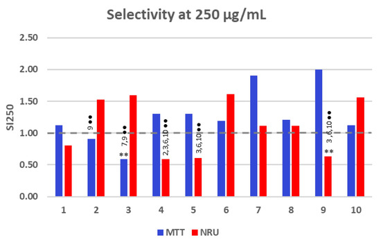 Since a defined SI value could not be determined in several cases due to the lack of IC50 values, a pseudo-selectivity index (SI) at the highest tested concentration (SI250) was calculated for all compounds. Figure 4 presents the selectivity values for compounds 1–10, as determined by the MTT and NRU methods.