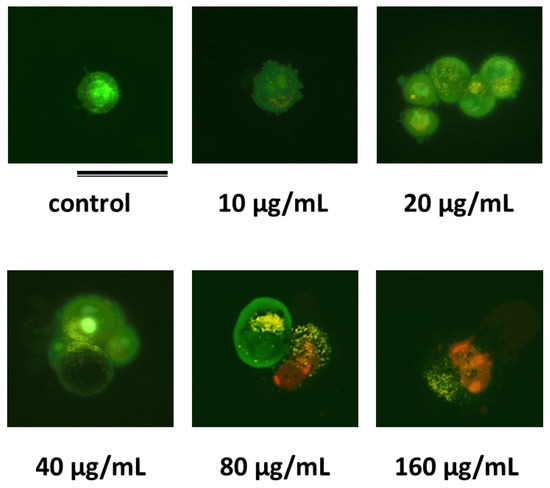 Considering the obtained results concerning the selective behavior of compound 1 (Table 1), tumor cells were incubated in the presence of compound 1 at different concentrations below and above their IC50 value, and were then stained with the nucleic acid-binding fluorochromes AO and EtBr to evaluate the induced morphological alterations that could be attributed to one mechanism or another [21,22]. Figure 5 shows representative fluorescence microscopy images under the assayed conditions. The untreated cells mainly exhibited a green fluorescence, due to the exclusion of EB but not of AO. Viable cells showed a light green nucleus with an intact structure and presented punctate orange-red fluorescence in the cytoplasm, representing lysosomes stained by AO. Following treatment with compound 1, an increase in the number of apoptotic cells has been revealed, showing early apoptotic live cells (green) with chromatin super-aggregation, i.e., highly condensed chromatin at the lowest compound 1 concentration. By increasing the concentration (20–40 µg/mL), a number of early apoptotic cells with fragmented nuclei exhibited punctate or bubbly AO distribution in the cytosol. Apoptotic cells with a split nucleus and weak AO staining also exhibited punctate or aggregated AO staining in the cytosol. Above the IC50 values (80 μg/mL), red fluorescence begins to appear, likely indicating compromised membrane integrity, revealed through propidium iodide staining. This is associated with the transition from apoptosis to secondary necrosis. At the highest assayed concentration (160 µg/mL), bright red fluorescence dominated, pointing to necrotic cell death with a significant loss of membrane integrity.