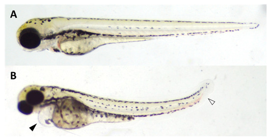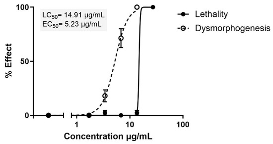 At 72 hpf, a concentration-response relationship was observed for lethality and dysmorphogenesis, with an LC50 (lethal concentration, the concentration killing 50% of individuals) of 14.91 µg/mL, and EC50 (effective concentration causing dysmorphogenesis in 50% of larvae) of 5.23 µg/mL, respectively (Figure 6). This resulted in a teratogenic index (TI) of 2.85, leading to a classification of potential teratogen (TI > 2) [25].