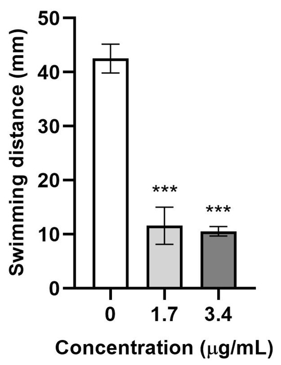 Evaluation of the TER after exposure to β-lactam 1. Results are presented as the mean ± SEM of swimming distance in millimeters. *** p < 0.001. The experiment was conducted three times with six embryos per concentration group, with each embryo receiving three tactile stimuli.