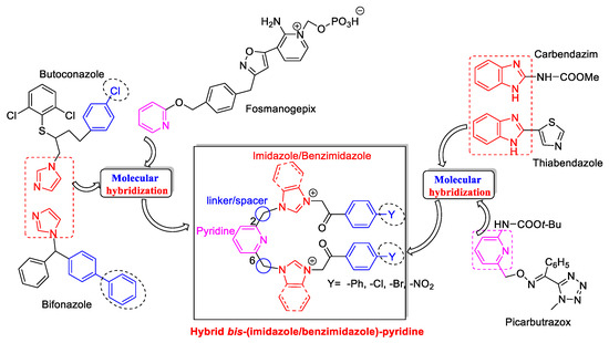 In the first instance, by using the molecular hybridization approach [40,42], we designed the new class of hybrid bis-(imidazole/benzimidazole)-pyridine derivatives by combining the pharmacophoric potential of the imidazole/benzimidazole azole moiety and the pyridine azine moiety, Scheme 1.