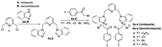 To synthesize our hybrid bis-(imidazole/benzimidazole)-pyridine derivatives, we used an adaptation of a previous method described by us [40,42], which involves a direct and efficient two-step reaction pathway, Scheme 2. In the first step, 2,6-bis(chloromethyl)pyridine 1 reacts with imidazole (2a)/benzimidazole (2b) via an N1-alkylation reaction, leading to the hybrid bis-(imidazole/benzimidazole)-pyridine 3a,b. In the second step, compounds 3a,b suffer a quaternization reaction of the second N3-nitrogen atom from imidazole/benzimidazole unit with α–bromo-para-Y-substituted-acetophenones 4ad, leading to the desired final products, the hybrid bis-(imidazole)-pyridine salts 5ad and hybrid bis-(benzimidazole)-pyridine salts 6ad.