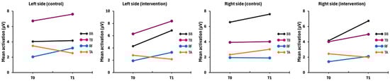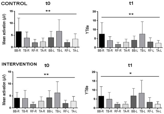 Mean basal activity of all muscle groups in the control and intervention groups at t0 and t1, with major changes in arm muscles. ** p < 0.01; * p < 0.05. Note: BB = Biceps brachii; TB = Triceps brachii; RF = Rectus femoris; TA = Tibialis anterior; L = Left; R = Right.