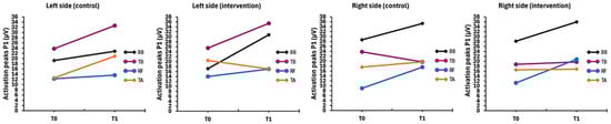 Comparison between the maximum peak muscle activation (P1) within the intervention and control groups (measurements 0 and 1) highlights the attenuation of the intervention group. Note: BB = Biceps brachii; TB = Triceps brachii; RF = Rectus femoris; TA = Tibialis anterior; P1: activation peak (maximum).