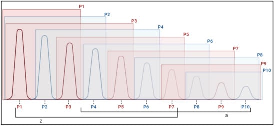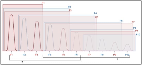 Peak muscle activation in the TA-L of ALS patients in the control group (CG) after two months of treatment. z and a represent subgroups formed according to Dunn’s multiple comparison test. Note: P1–P10: activation peak (P1 major to P1 minor); z, a: groups of peaks of similar activation.
