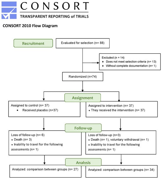 The sample consisted of 61 participants (men and women) diagnosed with medullary and bulbar ALS, 27 in the control group (CG), and 34 in the intervention group (IG). For patient recruitment, the main ALS centers at the state level were contacted, and after being informed of the nature of the project by means of a patient information sheet, they signed an informed consent form if they agreed to participate. The selection criteria were then applied. The inclusion criteria were as follows: men older than 18 years, women older than 18 years or between 18 and 50 years of age, patients diagnosed with ALS at least six months before the start of the study, and patients treated with riluzole. The exclusion criteria were as follows: tracheotomy, invasive or noninvasive ventilation with positive ventilatory pressure, participation in another trial or in the 4 weeks prior to inclusion, patients with evidence of dementia, alcohol or drug abuse dependence, patients infected with hepatitis B or C, human immunodeficiency virus-positive, renal patients with creatinine 2 times above normal markers 30 days prior to inclusion, and liver patients with liver markers (ALT and AST) elevated 3 times above normal levels. All the participants signed an informed consent form before the start of the study. Patients were recruited by random sampling through the ALS national associations as part of the clinical trial NCT04654689.