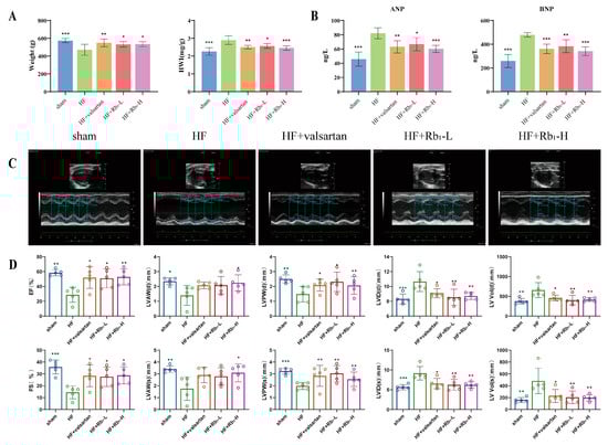 Echocardiography was employed to assess whether ginsenoside Rb1 altered cardiac function in rats with HF following MI. The results indicated that in the HF group, the ejection fraction (EF) and fractional shortening (FS) were reduced (p < 0.05 or p < 0.01), while the LV end-diastolic and end-systolic internal diameters (LVID(d) and LVID(s)), as well as the LV end-diastolic and end-systolic volumes (LV vol (d) and LV vol (s)), were increased (p < 0.05 or p < 0.01). Additionally, the LV end-diastolic and end-systolic anterior wall thicknesses (LVAW(d) and LVAW(s)), as well as the LV end-diastolic and end-systolic posterior wall thicknesses (LVPW(d) and LVPW(s)), were significantly decreased (p < 0.05 or p < 0.01) (Figure 2C,D); the heart weight index (HWI) was significantly increased (p < 0.05 or p < 0.01 or p < 0.001) (Figure 2A), indicating left ventricular enlargement, abnormal cardiac structure, and weakened cardiac contractile function. However, after the administration of ginsenoside Rb1 or valsartan, EF and FS increased, LVAW(d) and LVAW(s) increased, LVPW(d) and LVPW(s) increased, LVID(d) and LVID(s) decreased, and LV Vol(d) and LV Vol(s) decreased. Natriuretic peptides are widely used in the diagnosis and evaluation of HF and are representative biomarkers of myocardial injury, closely related to the prognosis of HF [20]. Therefore, we detected the expression of atrial natriuretic peptide (ANP) and brain natriuretic peptide (BNP). Biochemical analysis showed that compared to the HF group, ginsenoside Rb1 administration significantly inhibited the abnormal increase in ANP and BNP levels (p < 0.05 or p < 0.01 or p < 0.001) (Figure 2B). These results suggest that ginsenoside Rb1 can improve cardiac contractile function and reduce myocardial injury in HF rats.