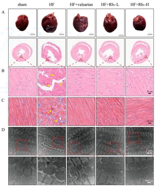 Ginsenoside Rb1 can improve the pathological changes of the left ventricle in rats with HF. (A) Pictures of rat hearts. (B) Representative HE-stained myocardial tissue sections (n = 6). Bar = 20 µm (40× original magnification). The yellow arrow indicates the typical pathological changes of myocardial tissue. (C) Representative Masson-stained images of cardiac tissue sections (n = 6). Bar = 20 µm (40× original magnification). The yellow arrow indicates the typical pathological changes of myocardial tissue. (D) Observation on the ultrastructure of the hearts of rats with HF screened by a transmission electron microscope (n = 5). Bar = 2 µm or Bar = 500 nm (10,000× original magnification or 30,000× original magnification, the picture below the red dotted line is an enlargement of the picture above.).