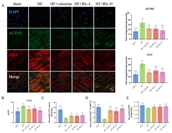 Ginsenoside Rb1 can improve myocardial injury in rats with HF. (A) Evaluation of cTnT and ACTN2 expression of cardiac tissues on rats with HF using immunofluorescence. (n = 6). Bar = 20 µm (40× original magnification). (B) Evaluation of cTnT expression in the serum of rats with HF using ELISA method (n = 6). (C–E) Ginsenoside Rb1 regulated ATP content, ETC productivity efficiency, and MMP level in the heart tissue of rats with HF (n = 6). Compared with the HF group, *** p < 0.001, ** p < 0.01, * p < 0.05.