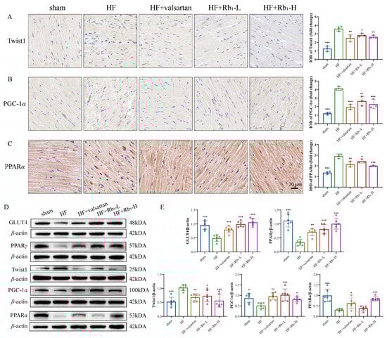To investigate the effects of ginsenoside Rb1 on myocardial energy metabolism in rats with HF by regulating the Twist1/PGC-1α/PPARα signaling pathway, WB was performed to verify the expression of Twist1, PGC-1α, and PPARα in rat myocardium. The results showed that ginsenoside Rb1 could significantly reverse the upregulation of Twist1 (p < 0.05 or p < 0.001) and the downregulation of PGC-1α and PPARα (p < 0.05 or p < 0.001) in rat myocardium. Additionally, GLUT4 and PPARγ were significantly decreased in the myocardium of rats with HF, while ginsenoside Rb1 inhibited the decrease in GLUT4 and PPARγ (p < 0.01 or p < 0.001) (Figure 5A,B). Subsequently, immunohistochemical staining methods were used to detect the expression of Twist1, PGC-1α, and PPARα in the myocardium of rats (Figure 5C–E). In the HF model group, the abnormal upregulation of Twist1 and the downregulation of PGC-1α and PPARα were significantly inhibited by ginsenoside Rb1.