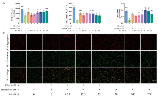 Detection of energy metabolism indexes of H9c2 cells: (A) Ginsenoside Rb1 regulated ATP content (n = 6), ETC productivity efficiency (n = 3), and MMP level (n = 3). (B) JC-1 mitochondrial membrane potential staining results. Compared with the ET-1 model group, *** p < 0.001, ** p < 0.01, * p < 0.05.