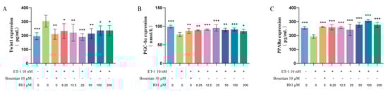 To further elucidate the mechanisms of action in both low-dose and high-dose ginsenoside Rb1 groups, we conducted additional validations at the cellular level. The results found that ginsenoside Rb1 significantly reversed the endothelin-1 (ET-1)-induced upregulation of Twist1 (p < 0.05, p < 0.01 or p < 0.001), inhibited the downregulation of PGC-1α and PPARα (p < 0.05, p < 0.01 or p < 0.001), and alleviated cardiomyocyte injury and energy metabolism disorders (Figure 7).