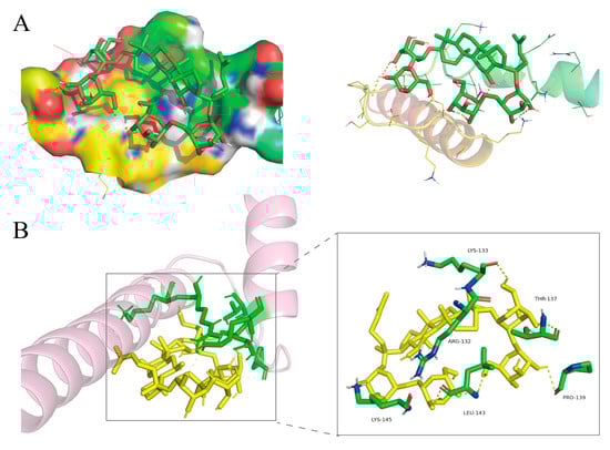 The molecular docking results between ginsenoside Rb1 and Twist1 were shown in Figure 8A. The affinity energy between ginsenoside Rb1 and Twist1 were calculated as −6.343 kcal/mol, indicating significant intermolecular affinity and high stability in the binding conformation. Furthermore, ginsenoside Rb1 can bind to the amino acid residues PRO139, THR137, LYS133, LEU143, ARG132, and LYS145 of Twist1 through hydrogen bonding or hydrophobic interactions, thereby affecting the conformational stability or DNA-binding ability of Twist1 (Figure 8B). These findings suggest that ginsenoside Rb1 exerts anti-HF effects by specifically targeting and modulating Twist1.