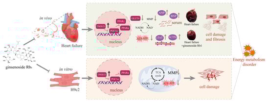 Ginsenoside Rb1 alleviates ventricular remodeling in HF by regulating the Twist1/PGC-1α/PPARα signaling pathway. In the hearts of rats with HF, there is an increase in the expression of cTnT and ACTN2. Additionally, there is an elevation in atrial and ventricular pressures, accompanied by an increased secretion of ANP and BNP. Myocardial cell damage occurs, inhibiting glucose transport (reduced GLUT4 synthesis), leading to mitochondrial dysfunction. This dysfunction manifests as a decrease in MMP, reduced ATP synthesis, and decreased ETC productivity efficiency, resulting in disordered energy metabolism. Furthermore, an abnormally high expression of Twist1 is observed, which inhibits the expression of PGC-1α, PPARα, and PPARγ, thereby exacerbating cardiac injury.