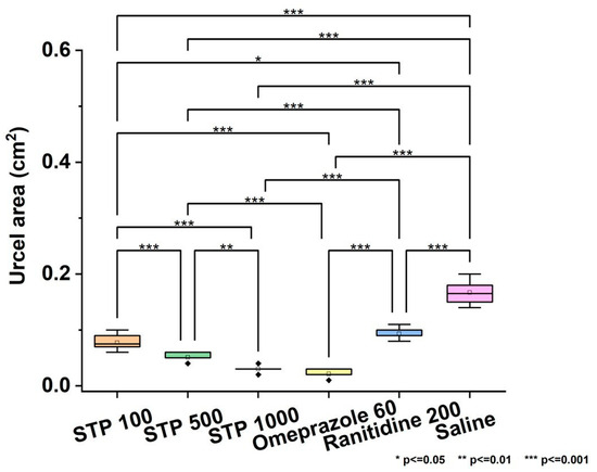 The effect of different doses of STP (100, 500, and 1000 µg/200 g), standard antiulcer drugs (omeprazole, ranitidine) and physiological solution (saline) on the ulcer area in experimental animals was analyzed. Data are presented as box plots, where the central line indicates the median and the upper and lower boundaries represent the 25th and 75th percentiles. Statistical analysis was performed using the nonparametric Kruskal–Wallis test followed by the Tukey test for multiple comparisons (significance level: p < 0.05). A significant decrease in ulcer area was observed in the groups receiving STP (especially at the maximum doses) and standard antiulcer drugs compared to the control group (saline). Statistically significant differences are indicated by asterisks (*** p < 0.001).