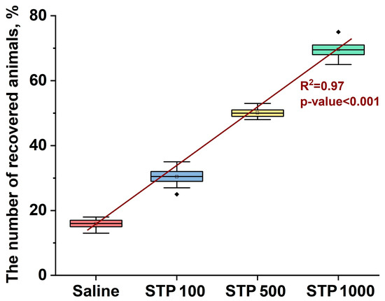 Dose–response analysis for STP. The graph shows the percentage of animals recovered as a function of the dose of the drug. The red line represents the linear trend. The rectangles show the distribution of data for each dose, where the horizontal line inside the rectangle is the median, the rectangle boundaries are the first and third quartiles, and the vertical lines are the minimum and maximum values. R2 = 0.97 indicates a strong correlation between dose and effect; p < 0.001 confirms the statistical significance of the results.
