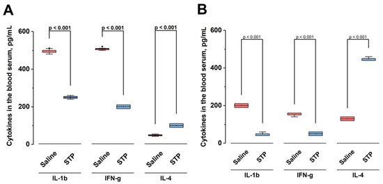 The effect of 500 µg/200 g STP on serum cytokine levels in experimental animals. (A) Cytokine levels on day 4 and (B) cytokine levels on day 10 of the experiment. Concentrations of IL-1b, IFN-γ, and IL-4 (pg/mL) in the main groups receiving saline and STP are shown. Boxplots show the distribution of data: the horizontal line inside is the median, the rectangle boundaries are the first and third quartiles, and the vertical lines are the minimum and maximum values. The analysis was performed using the nonparametric Kruskal–Wallis test. Statistical significance of differences between groups is indicated as p < 0.001 for all comparisons.