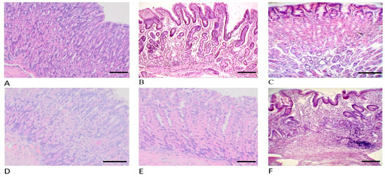 Histology of the rats’ stomachs on the 10th day after ulceration by the Okabe method. Hematoxylin and Eosin staining, ×200 magnification. (A) Group 1 with introduction of STP 1000 µg/mL/200 g. (B) Group 2 with the introduction of STP 500 µg/mL/200 g. (C) Group 3 with the introduction of STP 100 µg/mL/200 g. (D) Group 4 with the introduction of omeprazole 60 µg/200 g. (E) Group 5 with the introduction of ranitidine 200 µg/200 g. (F) Group 6 with the introduction of physiological solution (saline).