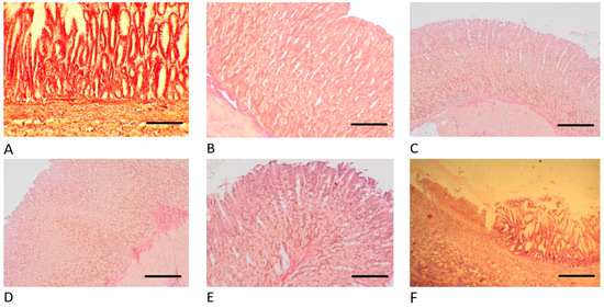 Histology of the rats’ stomachs on the 10th day after ulceration by the Okabe method. Van Gieson staining, ×200 magnification. (A) Group 1 with introduction of STP 1000 µg/mL/200 g. (B) Group 2 with the introduction of STP 500 µg/mL/200 g. (C) Group 3 with the introduction of STP 100 µg/mL/200 g. (D) Group 4 with the introduction of omeprazole 60 µg/200 g. (E) Group 5 with the introduction of ranitidine 200 µg/200 g. (F) Group 6 with the introduction of physiological solution (saline).