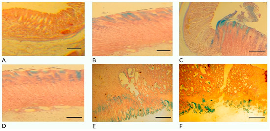 Histology of the rats’ stomachs on the 10th day after ulceration by the Okabe method. Alcian blue staining, ×200 magnification. (A) Group 1 with introduction of STP 1000 µg/mL/200 g. (B) Group 2 with the introduction of STP 500 µg/mL/200 g. (C) Group 3 with the introduction of STP 100 µg/mL/200 g. (D) Group 4 with the introduction of omeprazole 60 µg/200 g. (E) Group 5 with the introduction of ranitidine 200 µg/200 g. (F) Group 6 with the introduction of physiological solution (saline).