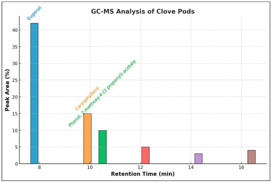 GC-MS chromatogram of clove (S. aromaticum) pods. GC-MS chromatogram of clove pod extract showing the major identified compounds. The x-axis represents retention time (minutes), while the y-axis shows the relative peak area (%). The labeled compounds correspond to their respective peaks, with color-coded text matching the bar colors for clarity.