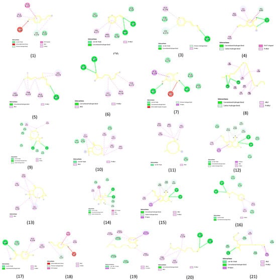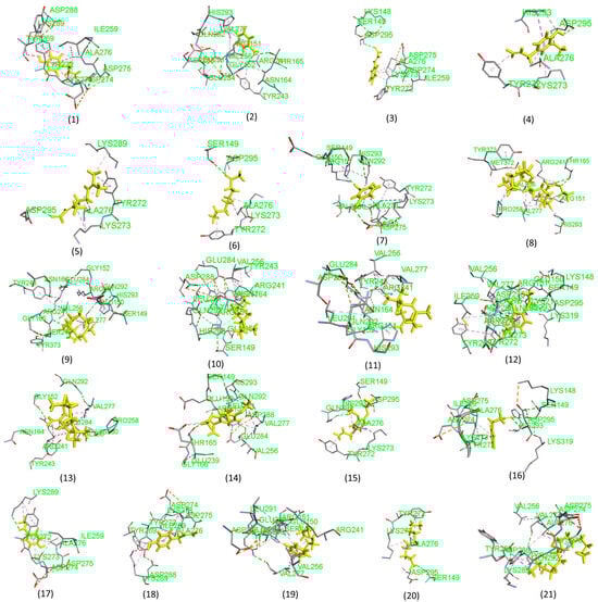 Two-dimensional plot of molecular docking results showing the interactions between the receptor (Staphylococcus aureus) and the ligands (compounds 1–21 from Syzygium aromaticum, as listed in Table 3).