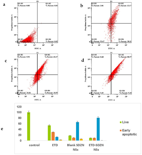 The developed nanoplatforms—ETD-SDZN NSs—obtained the most potent pattern in augmenting the pre-G phase, which concluded apoptotic cell death confirmed by the annexin-V staining assay. Our results were an argument for late apoptotic death.