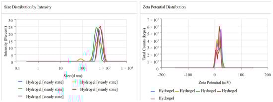 The Z-average and polydispersity index (PDI) values of the hydrogel showed a moderate-to-strong degree of polydispersity in particle size, with a particle size of 554.7 ± 90.1 nm. The polydispersity index (PDI) was 0.308 ± 0.158, suggesting a narrow range of particle sizes. The zeta potential of 15.16 ± 1.097 mV suggests moderate stability and compatibility for in vivo systems. The conductivity of 1.694 mS/cm indicates a stable ionic environment, which could be beneficial for the hydrogel’s potential use in drug delivery systems (Figure 2).