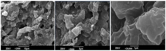 The SEM images show a porous, sponge-like structure of the CS-PEG-based hydrogel at different magnifications (10 µm, 5 µm, and 1 µm). The porous structure of the hydrogel shows dense interconnected CS-PEG. The open structure was formed due to different degrees of crosslinking between the amino group of CS and the hydroxyl group of PEG (Figure 3).