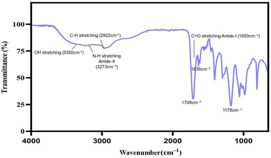 The FTIR spectrum of the hydrogel prepared from CS, PEG, and MAA confirmed its successful formation. Key peaks in the spectrum include O-H stretching (3350 cm−1), N-H stretching (Amide-II, ~3273 cm−1), C-H stretching (2922 cm−1), C=O stretching (Amide-I, ~1650 cm−1), C=O stretching (~1636 cm−1), Carbonyl (C=O) stretching (~1709 cm−1), and C-O stretching (Amide-I, ~1178 cm−1). These peaks confirm the presence of functional groups from all three components, with amide bonds indicating the crosslinking and interaction of CS with the other components. The peaks corresponding to C=O stretching from MAA and CS confirm the integration of these materials into the hydrogel network [28,29,30] (Figure 4).