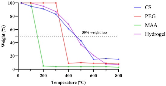 Thermogravimetric analysis was conducted on the individual components and the formulation to examine the percentage weight loss as a function of temperature. Among the individual components, CS exhibited the highest stability at higher temperatures, whereas MAA degraded by almost 90% when the temperature exceeded 100 °C. With 50% weight loss observed at approximately 460 °C, the hydrogel demonstrated sufficient stability for sterilization requirements in biomedical applications. The experiment was conducted up to 800 °C, and even at this temperature, approximately 7% of the hydrogel weight remained (Figure 5).