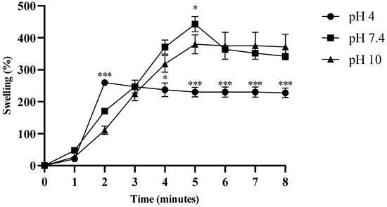 The swelling properties of the tested formulations. Swelling was performed at three different pH values: acetate buffer (pH 4.0), phosphate-buffered saline (pH 7.4), and borate buffer (pH 10). Significant differences were observed in hydrogel swelling at physiological (pH 7.4) and alkaline pH (pH 10), as compared to acidic pH (pH 4.0) (* p < 0.05, *** p < 0.0001).