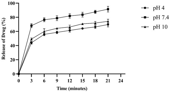 The drug entrapment efficiency of the hydrogel exhibited a rapid burst phase (0–3 min) at all pH values, with the fastest release occurring at physiological pH (pH 7.4). Subsequently, the stabilization phase (3–22 min) slowed down and stabilized the release rate. At pH 7.4, 91.25% of fluconazole was released in 21 min, whereas at pH 10, the release was 74.3%, and at pH 4, it was 69.8%. The rate of drug release was pH-dependent (Figure 8).