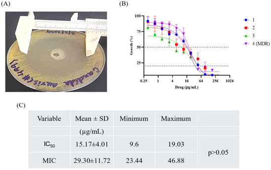 Different strains of C. auris were subjected to serial dilutions of the antifungal hydrogel. Zone of inhibition was measured (A) and IC50 values were calculated by fitting the dose–response curves to a sigmoidal model. Numbers 1, 2, 3, and 4 (MDR) represent the clinical isolates of C. auris. (B). MIC values were calculated according to the CLSI guidelines (M27, ED4). The MIC values were calculated in triplicates (C).