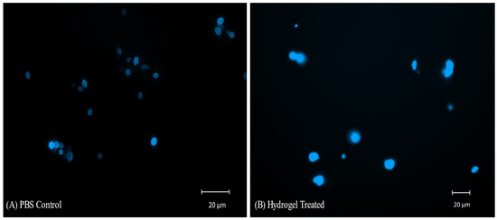 The images of hydrogel-treated yeast cells after staining with CFW show diffuse irregular yeast cells with improper morphology. The images suggest lysis, increased membrane permeability, and disintegration of the cell wall after the hydrogel treatment. Increased permeability leads to the staining of internal nuclear envelopes and polysaccharide-containing organelles, resulting in a diffused irregular appearance and higher absorption of fluorescence. The PBS control shows clear cell walls with oval-to-elliptical yeast cells (Figure 10).