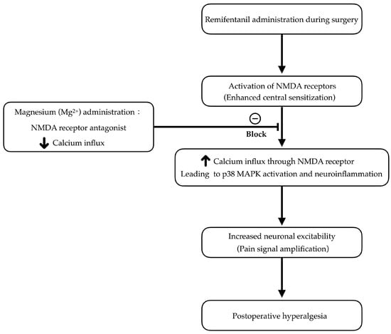 Central sensitization, predominantly involving N-methyl-D-aspartate (NMDA) receptor pathways, has been identified as a pivotal mechanism underlying opioid-related hyperalgesia [2]. Excessive NMDA receptor activity not only heightens nociceptive transmission but may also engage the p38 mitogen-activated protein kinase (p38 MAPK) cascade, thus exacerbating postoperative pain [3]. In this context, magnesium, a physiological NMDA receptor antagonist, has attracted considerable attention for its potential to moderate hyperalgesia processes [4]. By modulating NMDA receptor excitation, magnesium could suppress central sensitization, reduce postoperative pain intensity, and possibly curtail perioperative opioid requirements [5,6] (Figure 1). Emerging data further indicate that magnesium’s analgesic and anti-inflammatory attributes may provide broader perioperative advantages [6]. Even so, some investigations have found its benefits to be inconsistent. For instance, in a systematic review of multiple randomized controlled trials (RCTs), Lysakowski et al. [7] observed that magnesium did not confer uniformly positive analgesic outcomes, suggesting a high degree of variability in patient populations and protocols. This lack of consensus leaves the precise function of magnesium in remifentanil-based anesthesia open to question.
