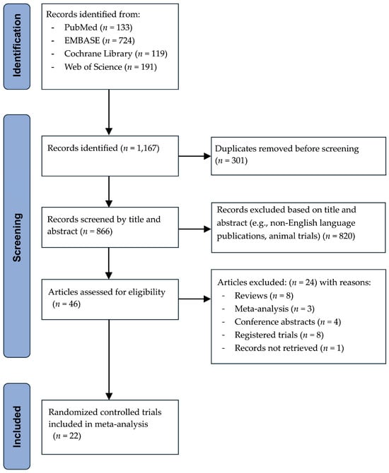 The initial database search identified 1167 records of which 301 were removed as duplicates before screening. An additional 820 citations were excluded upon title and abstract review because they were non-English articles, animal studies, or lacked relevance to the research question. Subsequently, 46 articles underwent full-text assessment, leading to the exclusion of 8 reviews, 3 meta-analyses, 4 conference abstracts, 8 registered trials without posted results, and 1 unobtainable document. Ultimately, 22 RCTs [4,21,22,23,24,25,26,27,28,29,30,31,32,33,34,35,36,37,38,39,40,41] fulfilled the eligibility criteria. No further relevant publications were identified through manual searches of reference lists. The overall identification and selection process adhered to the PRISMA guidelines (Figure 2).