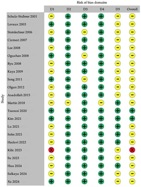 Using the Cochrane RoB 2 tool, two studies were deemed at low risk of bias [32,33], most were evaluated as having “some concerns” [4,21,22,23,24,25,26,27,28,29,30,31,34,35,36,38,39,40,41], and one trial (Kilic et al., 2023) was judged to be at high risk of bias [37]. A graphical summary of these assessments is presented in Figure 3.