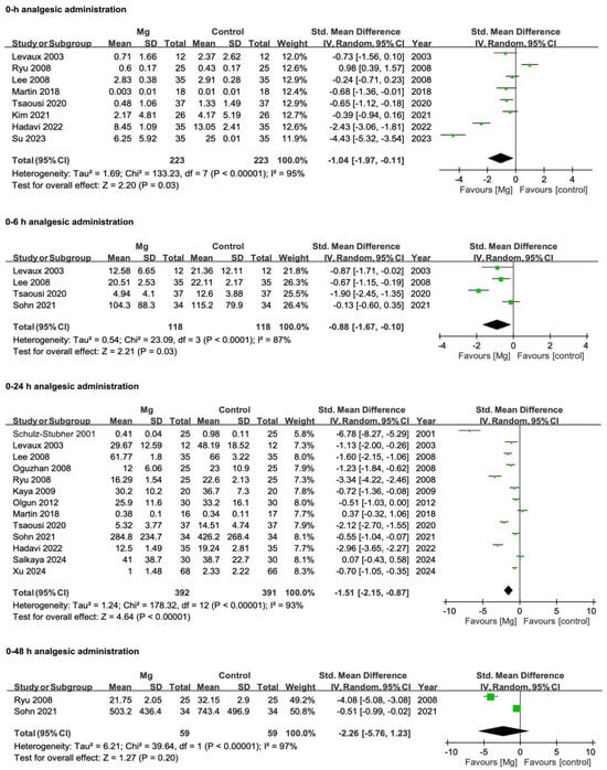 Forest plots illustrating the differences in postoperative analgesic administration between Mg and control at 0 h, 0–6 h, 0–24 h, and 0–48 h. Effect sizes are reported as SMDs with 95% CIs, derived from a random-effects model using the IV method. Negative values indicate reduced analgesic requirements with Mg, whereas positive values favor the control. Squares represent individual study estimates (weighted by sample size) and diamonds represent the pooled effect. Mg, magnesium; CI, confidence interval; IV, inverse variance; SD, standard deviation; SMD, standardized mean difference; Std., standard. References [4,21,22,25,26,27,29,31,32,33,35,36,38,40,41].