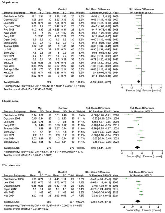 Postoperative pain intensity was measured using instruments such as the Numeric Analogue Scale (NAS), Visual Analogue Scale (VAS), Verbal Rating Scale (VRS), Verbal Numeric Rating Scale (VNRS), or Numeric Rating Scale (NRS). Two RCTs demonstrated statistically significant differences favoring magnesium but did not provide extractable numerical data [21,22]; thus, they were included qualitatively but excluded from the meta-analysis of pain scores. In the remaining 20 RCTs, most studies employed a 0–10 scale, although a small number used a 0–100 VAS [4,23]. Where both rest- and effort-related scores were reported, only rest-state values were extracted [4]. Five reference time points (0, 6, 12, 24, and 48 h) were applied to ensure consistency.
