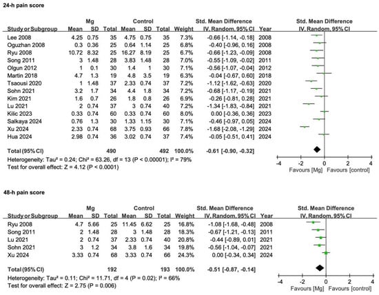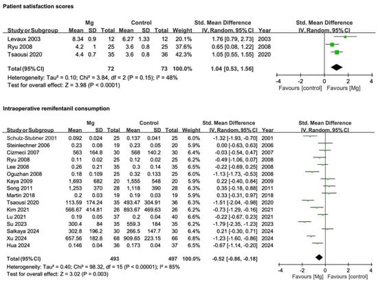 For postoperative analgesic requirements, the recalculated SMD was −0.74 (95% CI −0.95 to −0.53; p < 0.00001) at 0 h, −0.81 (95% CI −1.09 to −0.54; p < 0.00001) at 6 h, −1.05 (95% CI −1.21 to −0.89; p < 0.00001) at 24 h, and −1.18 (95% CI −1.62 to −0.75; p < 0.00001) at 48 h. Similarly, the fixed-effects analysis for postoperative pain scores yielded SMDs of −0.48 (95% CI −0.60 to −0.37; p < 0.00001) at 0 h, −0.74 (95% CI −0.92 to −0.56; p < 0.00001) at 6 h, −0.41 (95% CI −0.61 to −0.21; p < 0.0001) at 12 h, −0.63 (95% CI −0.76 to −0.50; p < 0.00001) at 24 h, and −0.41 (95% CI −0.61 to −0.21; p < 0.0001) at 48 h, while intraoperative remifentanil consumption also remained in favor of magnesium (SMD −0.55, 95% CI −0.68 to −0.42; p < 0.00001).