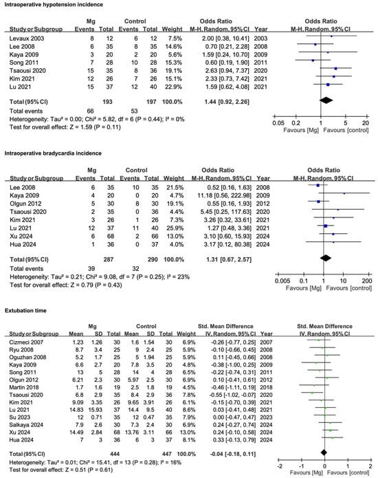 Forest plots comparing Mg with the control for intraoperative hypotension and bradycardia incidence, extubation time, number of patients requiring rescue analgesia, shivering, PONV, patient satisfaction, and intraoperative remifentanil consumption. Dichotomous outcomes are expressed as ORs with 95% CIs and continuous outcomes are presented as SMDs, all derived from a random-effects model. The M–H method was used for dichotomous data and the IV method was used for continuous data. Squares represent individual study estimates (weighted by sample size) and diamonds indicate the pooled effects. CI, confidence interval; IV, inverse variance; M–H, Mantel–Haenszel; Mg, magnesium; PONV, postoperative nausea and vomiting; SD, standard deviation; SMD, standardized mean difference; Std., standard. References [4,21,22,23,24,25,26,27,28,29,31,32,33,34,35,36,38,39,40,41].