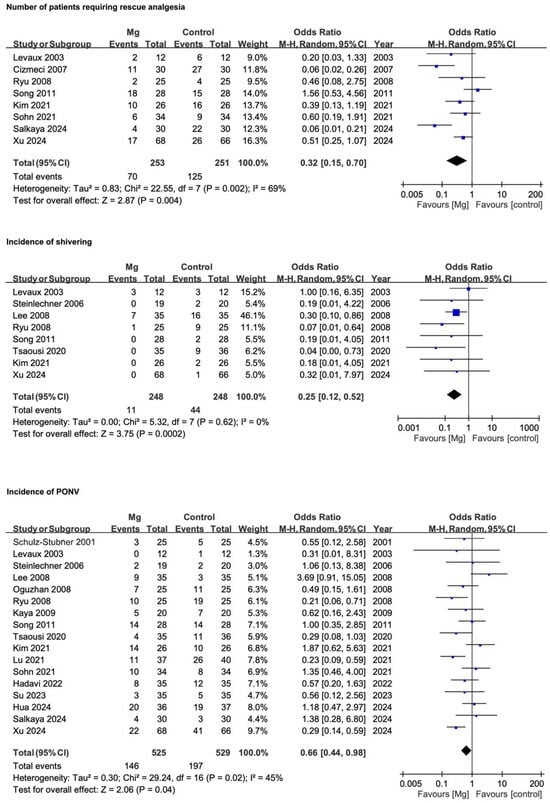 Seventeen RCTs provided numerical data on postoperative nausea and vomiting, while others reported insufficient or zero-event findings [24,29,30,31,37]. Overall, magnesium was associated with a significant reduction in PONV events (OR 0.66, 95% CI 0.44–0.98; p = 0.04; I2 = 45%).