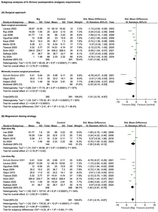 Subgroup analyses of 0–24 h postoperative analgesic requirements. (A) Surgical approach (open vs. minimally invasive procedures); (B) Magnesium dosing strategy (high-dose vs. low-dose regimens). Effect sizes are expressed as SMDs with 95% CIs, derived from random-effects models. Squares indicate individual study estimates and diamonds represent pooled effects. CI, confidence interval; Mg, magnesium; SMD, standardized mean difference; Std., standard; IV, inverse variance; SD, standard deviation. References [4,21,22,25,26,27,29,31,32,35,36,40,41].