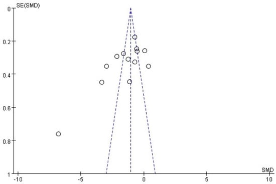 - Sterne, J.A.; Sutton, A.J.; Ioannidis, J.P.; Terrin, N.; Jones, D.R.; Lau, J.; Carpenter, J.; Rucker, G.; Harbord, R.M.; Schmid, C.H.; et al. Recommendations for Examining and Interpreting Funnel Plot Asymmetry in Meta-Analyses of Randomised Controlled Trials. BMJ 2011, 343, d4002. [Google Scholar] [CrossRef]