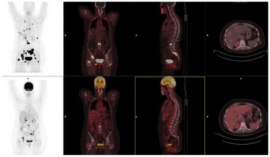 Beyond detecting primary lesions, 68Ga-FAPI PET/CT identified additional lesions with a lower background activity and greater uptake in lymph node, liver, lung, and bone metastases in breast cancer patients []. Figure 3 highlights the superior detection of breast cancer metastases on FAPI PET/CT compared to FDG PET/CT. Furthermore, 68Ga-FAPI PET/CT enables early response assessment during and after treatment, providing a valuable tool for therapy monitoring [].