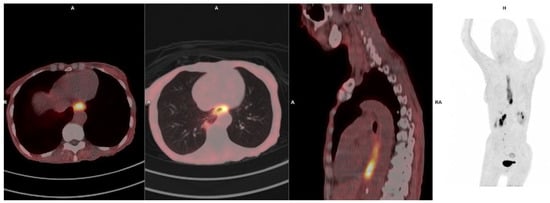 - Kullik, Y.; Wessendorf, T.E.; Theegarten, D.; Winantea, J.; Hautzel, H.; Opitz, M. Aspergillus fumigatus: Is Dual-Tracer 18FDG/68Ga-FAPI PET/CT Capable of Distinguishing Fungal Infection and Unspecific Inflammation from Recurrent Lung Cancer? Clin. Nucl. Med. 2024, 49, 1046–1047. [Google Scholar] [CrossRef]