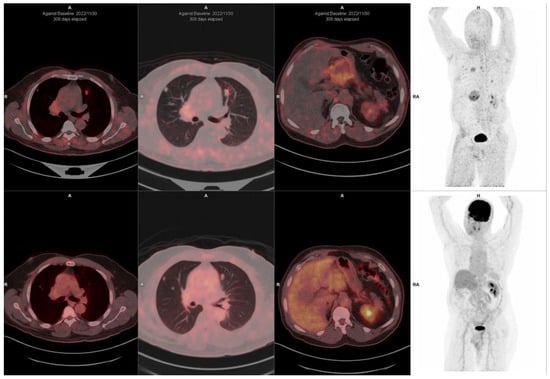 Ballal et al. [] further demonstrated the superiority of 68Ga-DOTA.SA.FAPI PET/CT in detecting metastases in lymph nodes, the liver, brain, and bowel, while also reporting lower false-positive and false-negative rates compared to 18F-FDG PET/CT. Regarding lung metastases, 68Ga-DOTA.SA.FAPI PET/CT exhibited a higher detection accuracy than 18F-FDG PET imaging []. Similarly, Nourbakhsh et al. found that FAPI-based PET/CT identified additional lung metastases, leading to upstaging in 20% of patients with lung metastases [].